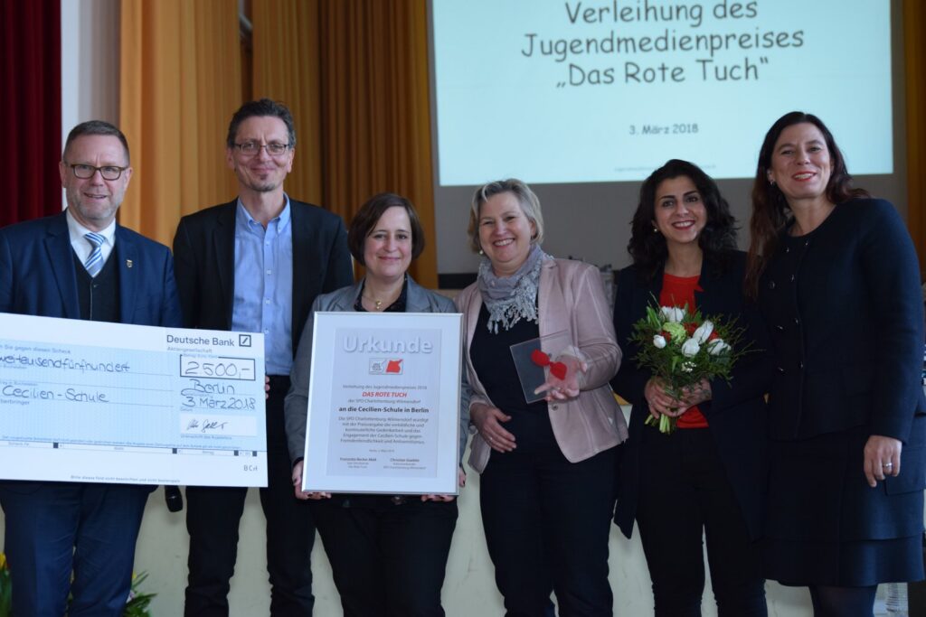 Im Jahr des 40-jährigen Bestehens des antifaschistischen Jugendpreis 2018 ging „Das Rote Tuch“ an die Cecilien-Grundschule in Wilmersdorf für ihr langjähriges und vielfältiges öffentliches Engagement gegen Fremdenfeindlichkeit und Antisemitismus. Die Jury würdigte mit der Auszeichnung die vorbildlichen Projekte, mit denen die Wilmersdorfer Schule ihr Leitbild Frieden lernen mit Leben erfüllt, so etwa mit Patenschaften für Stolpersteine, interkulturellen Projekttagen sowie „Festen der Vielfalt“, in deren Rahmen die unterschiedliche Herkunft der Grundschulkinder thematisiert wird.